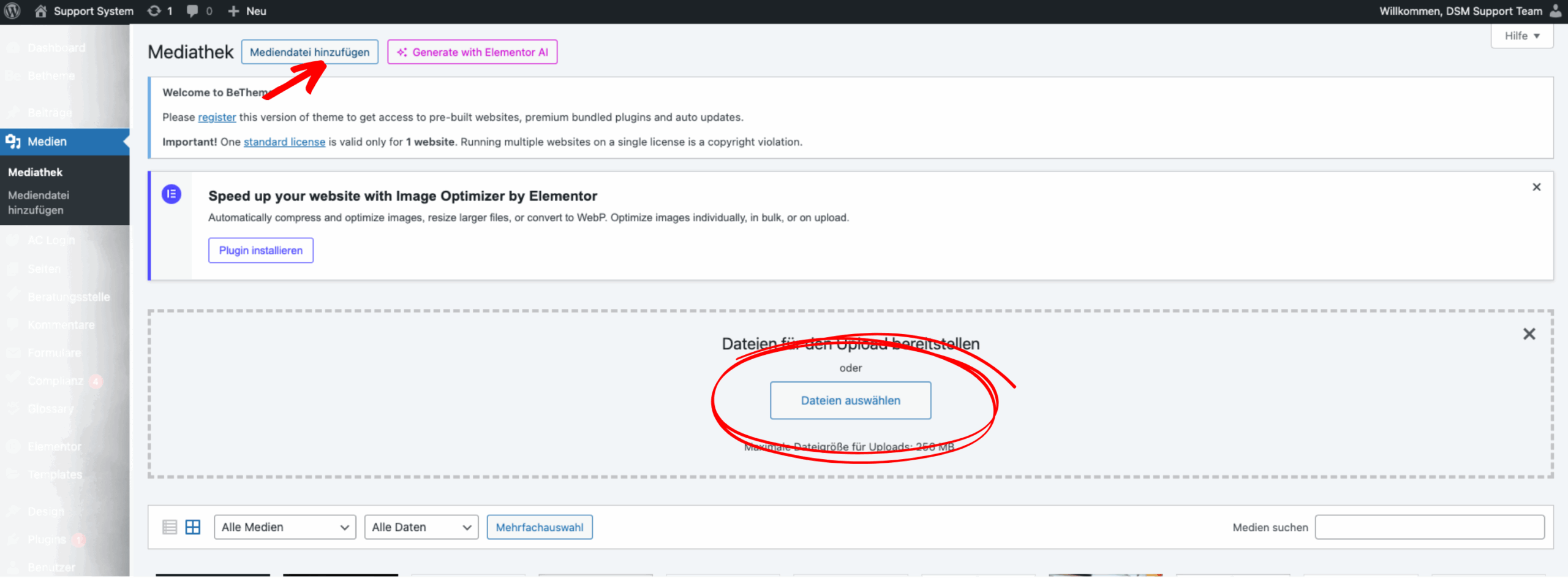 - Ziehen Sie Bilder einfach per Drag & Drop in die Mediathek oder klicken Sie auf „Dateien hochladen“.