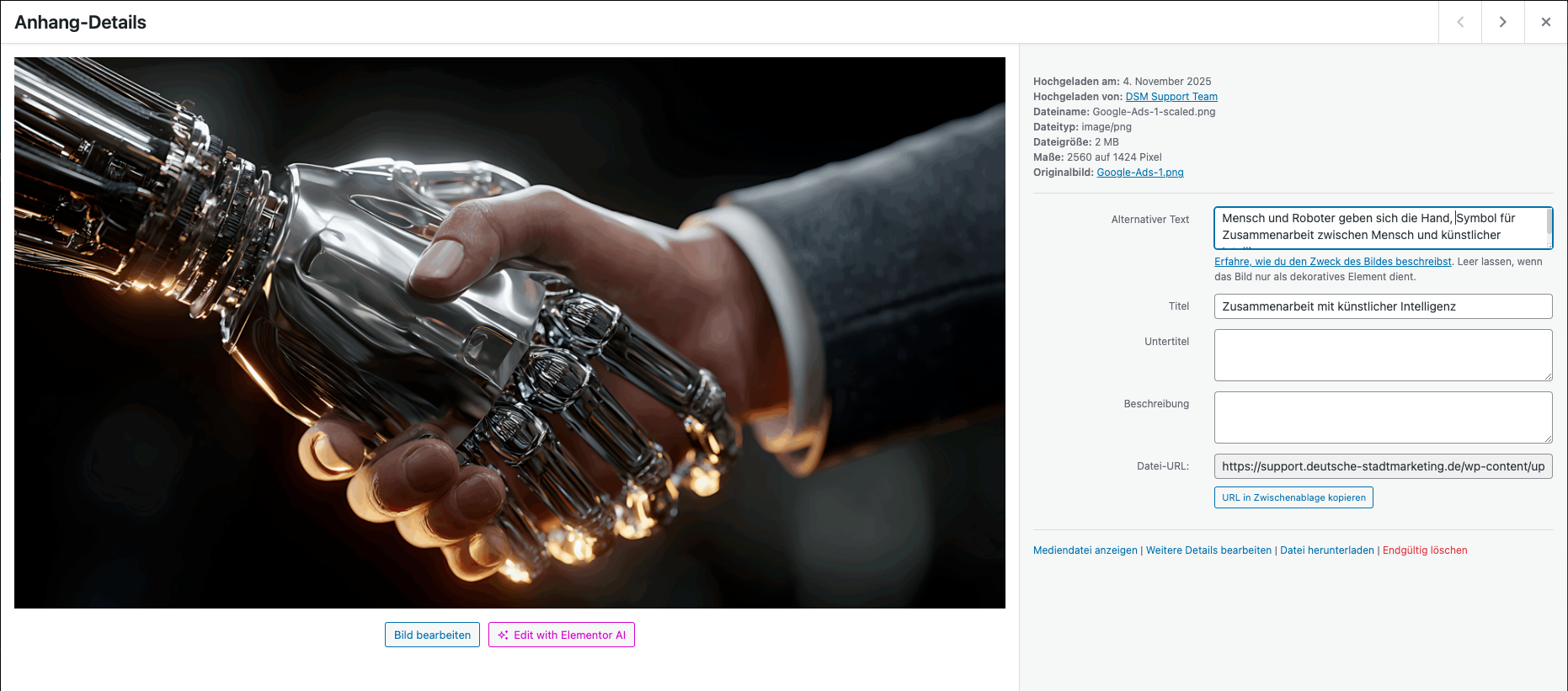Statt „IMG_1234.jpg“ → Alt-Text: „Mensch und Roboter geben sich die Hand. Symbol für Zusammenarbeit zwischen Mensch und künstlicher Intelligenz.“