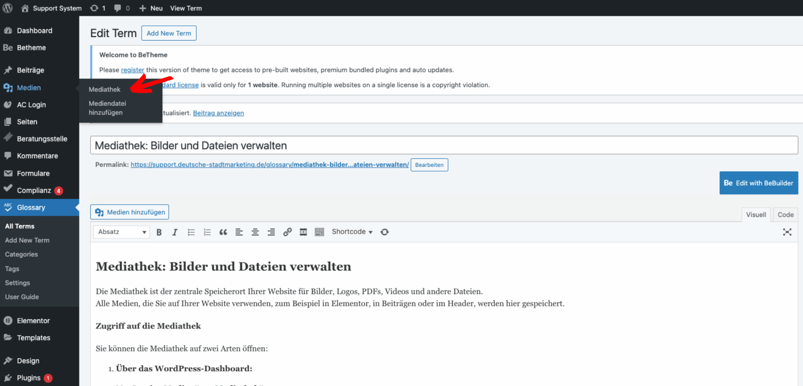 Alle Medien, die Sie auf Ihrer Website verwenden, zum Beispiel in Elementor, in Beiträgen oder im Header, werden hier gespeichert.